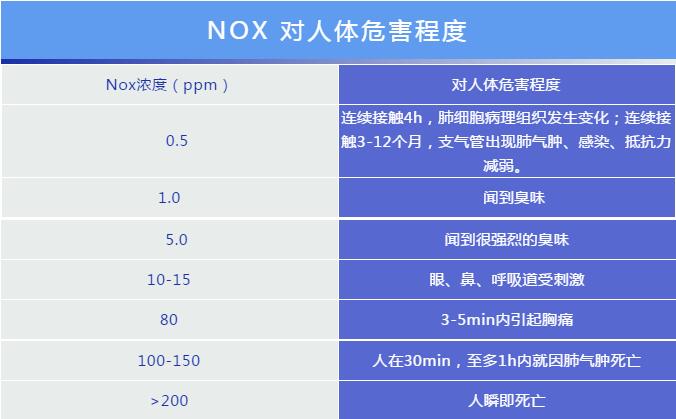 NO2為黃色液體或棕紅色氣體,能溶于水、生成硝酸和亞硝酸,具有腐蝕性。NO和血紅蛋白的親和力比CO大幾百倍,動物接觸高濃度的NO,可出現(xiàn)中樞神經(jīng)病變。NO2對眼和呼吸氣管有刺激作用,高濃度的NO2急性中毒能引起氣管炎和肺氣腫,嚴重者可導致死亡。NOX還可形成光化學煙霧、嚴重影響視野,NOX分級濃度的危害程度見表1。