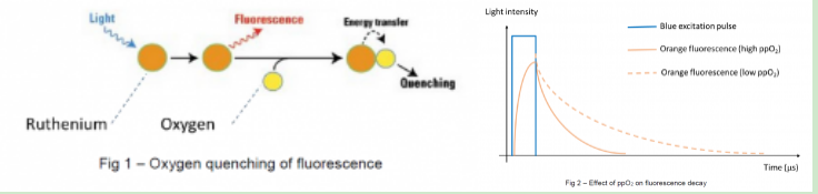 該傳感器的氧測量技術(shù)基于有機金屬熒光染料的熒光猝滅。由于金屬-配體電荷轉(zhuǎn)移(MLCT)的有效過程,染料在可見光譜的藍色區(qū)域吸收并在橙紅色區(qū)域顯示強熒光。氧分子和激發(fā)狀態(tài)染料的碰撞導(dǎo)致熒光分子更快地還原到基態(tài),因此氧氣的存在猝滅了熒光強度和染料的熒光時長。因此,存在的氧越多,熒光強度和持續(xù)時間降低越大。