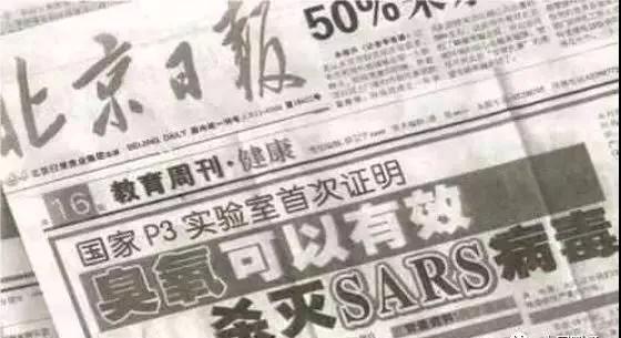 武漢大學(xué)生命科學(xué)學(xué)院的張珈敏,鄭從義等人在“中國消毒學(xué)雜志”2004年01期上發(fā)表的《臭氧水對SARS病毒的滅活效果觀察》一文中寫:用臭氧水對SARS病毒進(jìn)行滅活實(shí)驗(yàn),當(dāng)臭氧含量為27.73mg/L時(shí),作用4min可完全滅活SARS病毒;當(dāng)臭氧含量為17.82mg/L,作用4min和4.86mg/L作用10min,均可使SARS病毒的滅活率達(dá)100%。
