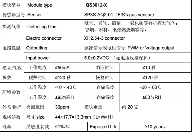 下圖為截取的Fis VOC傳感器模塊的部分參數(shù)說(shuō)明