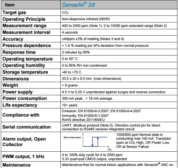 以SenseAir S8為例,對(duì)于CO2傳感器,我們關(guān)注點(diǎn)主要包括:測(cè)量范圍,精度,重復(fù)性,響應(yīng)時(shí)間,一致性,耐候性(工作溫度區(qū)間),功耗和壽命。