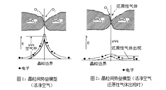在敏感材料內(nèi)部,自由電子必須穿過(guò)金屬氧化物半導(dǎo)體微晶粒的結(jié)合部位(晶界)才能形成電流。由氧吸附產(chǎn)生的勢(shì)壘同樣存在于晶界而阻礙電子的自由流動(dòng),傳感器的電阻即緣于這種勢(shì)壘。在工作條件下當(dāng)傳感器遇到還原性氣體時(shí),氧負(fù)離子因與還原性氣體發(fā)生氧化還原反應(yīng)而導(dǎo)致其表面濃度降低,勢(shì)壘隨之降低(見(jiàn)圖2),導(dǎo)致傳感器的阻值減小。
