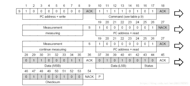 在非主機(jī)模式下, MCU 需要對(duì)傳感器狀態(tài)進(jìn)行查詢。此過(guò)程通過(guò)發(fā)送一個(gè)啟動(dòng)傳輸時(shí)序,之后緊接著是如圖所示的I2C 首字節(jié)(1000’0001)來(lái)完成。如果內(nèi)部處理工作完成,單片機(jī)查詢到傳感器發(fā)出的確認(rèn)信號(hào)后,相關(guān)數(shù)據(jù)就可以通過(guò)MCU 進(jìn)行讀取。如果測(cè)量處理工作沒(méi)有完成,傳感器無(wú)確認(rèn)位(ACK)輸出,此時(shí)必須重新發(fā)送啟動(dòng)傳輸時(shí)序。