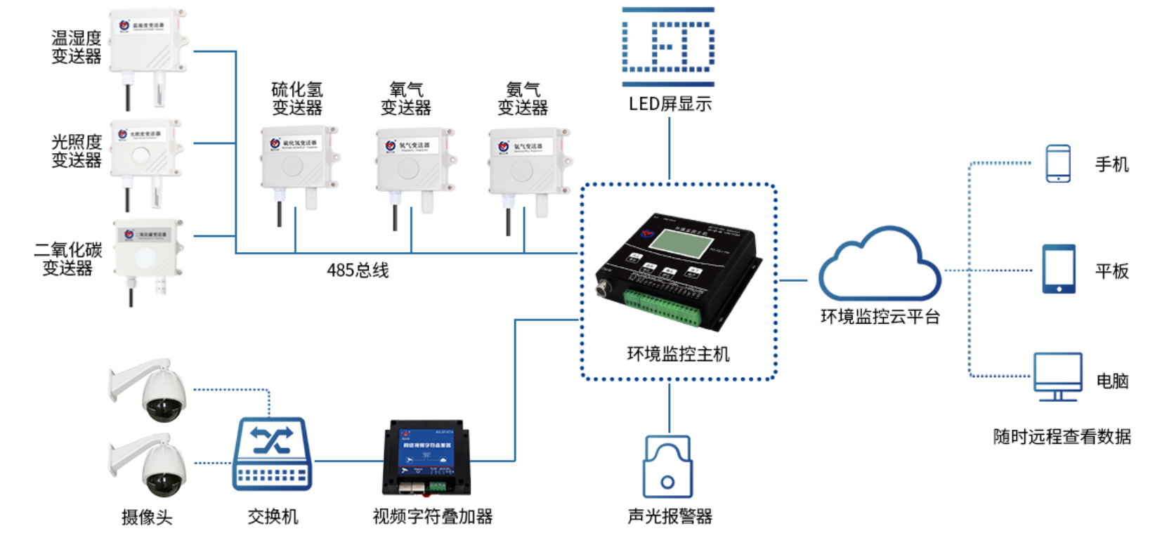 該系統(tǒng)采用RS485方式布線組網(wǎng),采集的各項(xiàng)環(huán)境數(shù)據(jù)匯總到環(huán)境監(jiān)控主機(jī),環(huán)境監(jiān)控主機(jī)多能夠掛接32臺(tái)養(yǎng)殖場所內(nèi)安裝的485型變送器,并通過GPRS/4G、以太網(wǎng)等方式將各要素的監(jiān)測數(shù)據(jù)上傳到LED大屏顯示和養(yǎng)殖環(huán)境監(jiān)控平臺(tái)。