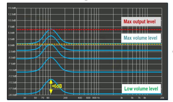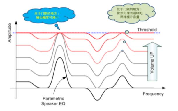 同樣例子,音量輸出是0dB,當(dāng)使用APEQ提升100Hz處6dB低頻增益后,低頻部分先達(dá)到預(yù)設(shè)門限;但是APEQ的增益值會(huì)隨著音量繼續(xù)上升而下降,此時(shí)整個(gè)頻段依然可以提升音量。