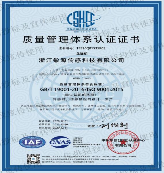本次ISO9001質(zhì)量管理體系認(rèn)證的通過,是對敏源傳感現(xiàn)有產(chǎn)品質(zhì)量管理體系的一種肯定及鞭策。公司將以此為契機,在ISO9001質(zhì)量管理體系的指引下,不斷提高企業(yè)的質(zhì)量管理、產(chǎn)品以及服務(wù)能力,增強客戶滿意度,用可靠的質(zhì)量、優(yōu)異的性能表現(xiàn)為廣大客戶創(chuàng)造更大價值!