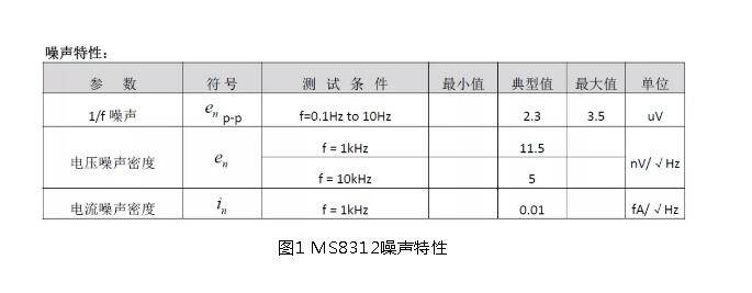 那么如何來看待這三個(gè)參數(shù)所表示的意義呢?首先要從噪聲的分類說起,噪聲粗分為外部噪聲和固有噪聲,外部噪聲主要為數(shù)字交換、60Hz噪聲以及電源交換等,而固有噪聲較常見的是熱噪聲(也叫白噪聲)、閃爍噪聲(1/f噪聲)和電流噪聲等。MS8312規(guī)格書中的噪聲特性測(cè)量的就是該運(yùn)放的常見的固有噪聲,其中電壓噪聲密度指的就是白噪聲在1KHz和10KHz時(shí)的噪聲功率,電流噪聲密度指的則是電流噪聲在1KHz時(shí)的噪聲功率。