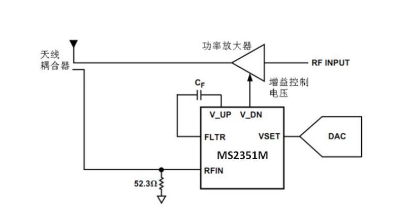 無線設備很多情況下需要對發(fā)射功率的增益做控制,因此首先需要檢測功率,然后將這個檢測到功率反饋給控制系統(tǒng)以形成閉環(huán)控制。之前在檢波器芯片市場上多以美系品牌為主,現(xiàn)在我們國產(chǎn)電子也推出了其?對數(shù)放大器芯片?MS2351M,它有兩種主要的工作模式,測量模式和控制模式,當?MS2351M?工作于控制模式時基本的連接方式如下圖所示: