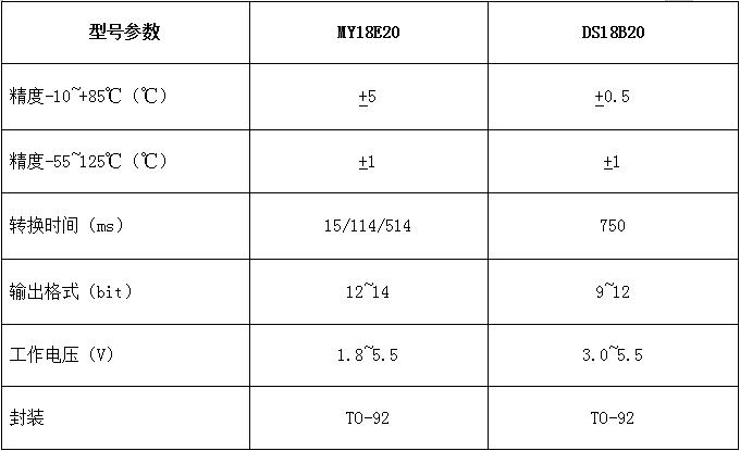 DS18B20和MY18E20在性能及封裝上幾乎完全一致,主要參數(shù)如下圖所示: