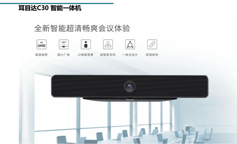 HamedalC30視頻會議一體機,是推出的新一代視頻會議智能終端,該產(chǎn)品擁有135°水平超大視角,采用1200萬像素鏡頭,支持4K超清視頻通話,以及聲源定位、語音追蹤、人臉檢測等多項AI技術(shù),為用戶提供更加智能優(yōu)質(zhì)的視頻會議體驗。內(nèi)置5單元全向麥克風(fēng)陣列及專業(yè)化定制高品質(zhì)全頻揚聲器,結(jié)合全新的音頻算法,可提供5米優(yōu)質(zhì)全雙工通話,支持多設(shè)備級聯(lián), 是各種大、中、小型會議室的絕佳伴侶。