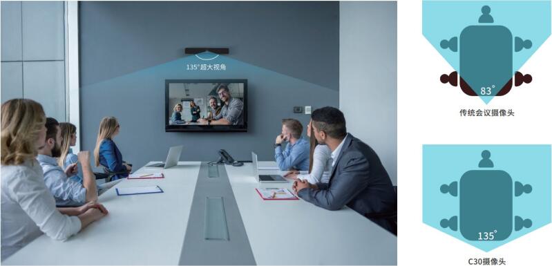 HamedalC30擁有特定的135°水平的超廣角鏡頭,可輕松將所有與會員都囊括屏中。同時采用1200萬像素鏡頭,支持4K超清視頻通話,讓細(xì)節(jié)呈現(xiàn)更加真實,會議體驗身臨其境。
