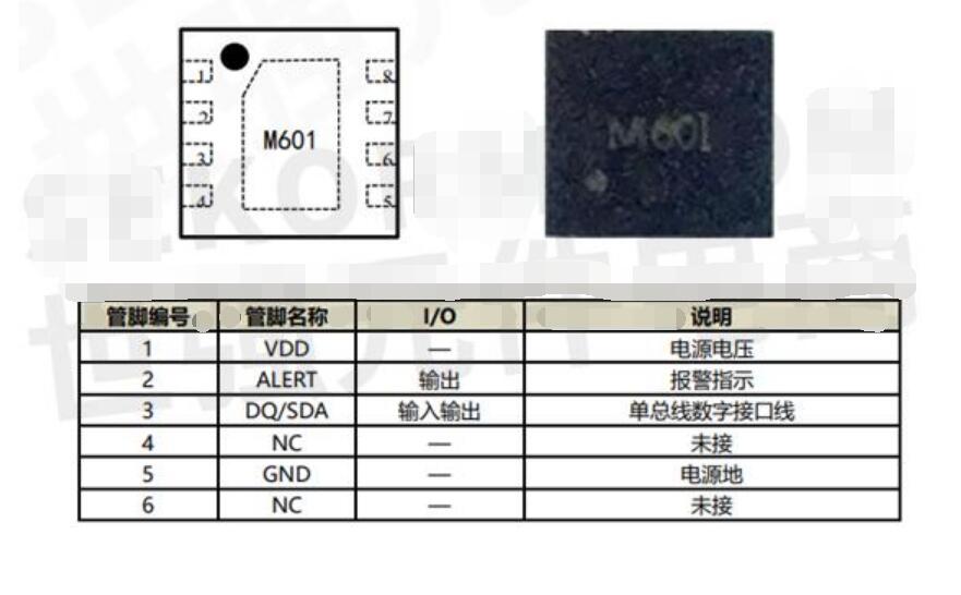 該器件的感溫原理是基于CMOS半導體PN節(jié)溫度與帶隙電壓的特性關(guān)系,經(jīng)過小信號放大、ADC模數(shù)轉(zhuǎn)化器、數(shù)字校準補償后進行數(shù)字信號輸出。M601傳感器采用單總線接口進行數(shù)據(jù)傳輸,相比于其他類型的數(shù)字接口,可以相應地節(jié)省MCU的IO資源。1.8V-5.5V工作電壓, M601具有更高的測量范圍,可以達到–70℃~+150℃溫度區(qū)間。M601溫度傳感器還集成了32bit額外的EEPROM空間,可以存放用戶自定義信息,用于保存芯片 ID 號、高低溫報警閾值、溫度校準修正等。