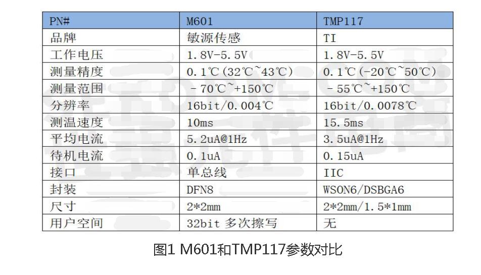 數(shù)字式溫度傳感器芯片 - M601是國產(chǎn)第四代高精度溫度傳感器芯片,該器件的感溫原理是基于CMOS半導(dǎo)體PN節(jié)溫度與帶隙電壓的特性關(guān)系,經(jīng)過小信號(hào)放大、ADC模數(shù)轉(zhuǎn)化器、數(shù)字校準(zhǔn)補(bǔ)償后進(jìn)行數(shù)字信號(hào)輸出。M601傳感器采用單總線接口進(jìn)行數(shù)據(jù)傳輸,相比于其他類型的數(shù)字接口,可以相應(yīng)地節(jié)省MCU的IO資源。另外,該傳感器還具有精度高、測溫速度快、低功耗及高壽命等優(yōu)點(diǎn)。該器件在功能上可以很好替換TI的TMP117溫度傳感器。如圖1所示為兩款產(chǎn)品的性能對(duì)比: