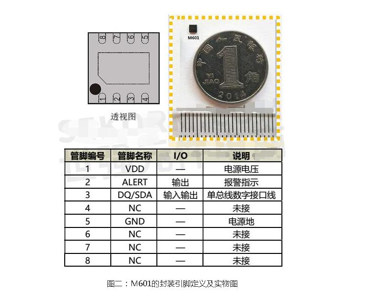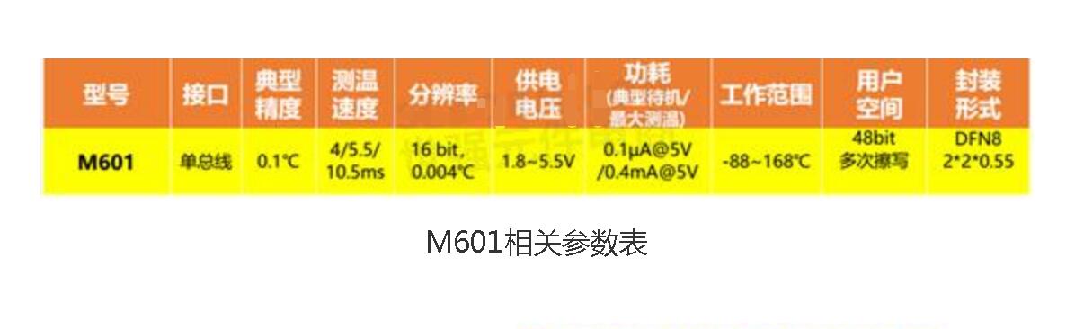 M601是國產(chǎn)的第四代數(shù)字高精度溫度傳感芯片,具有精度高(在32到43°C溫度區(qū)間,典型測溫精度0.1℃)、測溫快(速度可配置4ms/5.5ms/10.5ms)、功耗低、一致性好、可編程配置靈活等優(yōu)點。內(nèi)置非易失性 E2PROM 存儲單元,用于保存芯片 ID 號、高低溫報警閾值、溫度校準修正等。M601具體的相關(guān)參數(shù)如下表一所示: