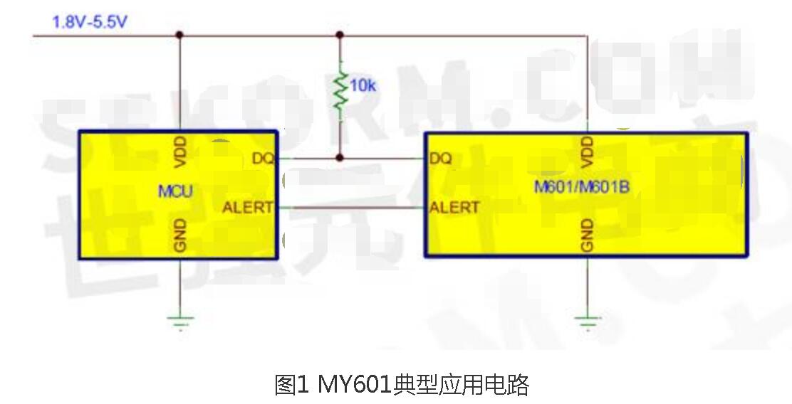 和目前常用的電子體溫計(jì)相比,體溫貼適用于嬰幼兒和老人體溫測量,M601在32℃~45℃溫度范圍內(nèi)測溫精度達(dá)到±0.1℃,可以在正常體溫范圍內(nèi)實(shí)現(xiàn)精準(zhǔn)溫度監(jiān)控;待機(jī)功耗0.1uA,可以延長體溫貼使用時(shí)間;該器件溫度轉(zhuǎn)換時(shí)間可以設(shè)置成4ms,便于長時(shí)間連續(xù)測試應(yīng)用。M601有可編程的ID序列號,便于組網(wǎng)尋址,內(nèi)部包含32bit存儲(chǔ)空間用于存放用于信息,還可以自行設(shè)置報(bào)警值,電路更簡單,成本更低,以下是溫度傳感芯片 - M601典型應(yīng)用電路。