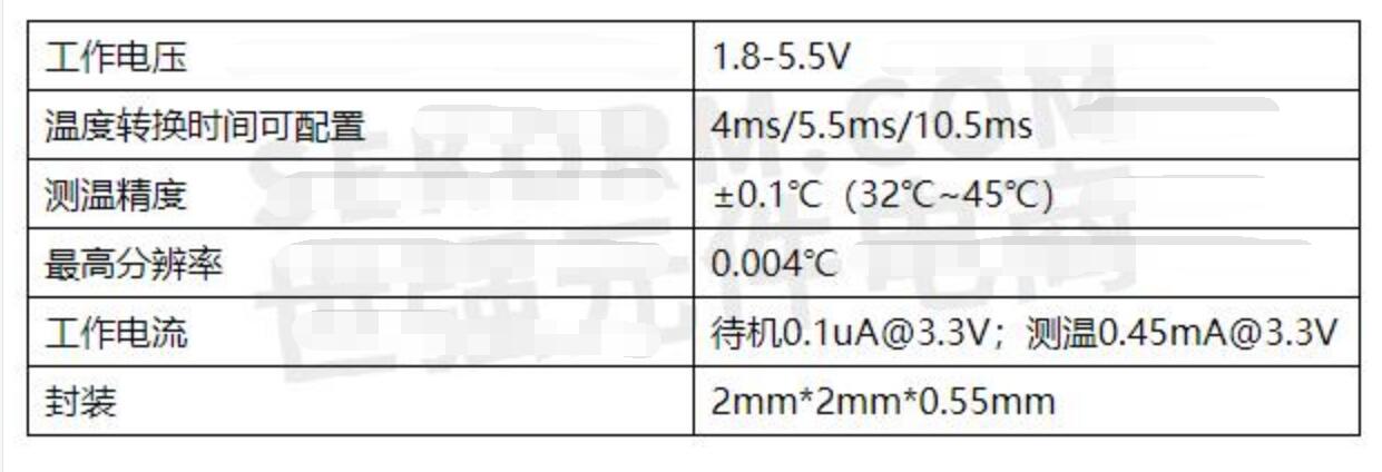 在體溫貼的設(shè)計(jì)中,溫度傳感器是核心的器件,由于體溫貼體積小,采用電池供電,因此要求溫度傳感器具有低功耗、測溫精度高、封裝小的優(yōu)勢。針對體溫貼中的測溫功能應(yīng)用,推薦由工采網(wǎng)代理的國產(chǎn)數(shù)字溫度傳感器芯片 - M601,該器件感溫原理基于CMOS半導(dǎo)體PN節(jié)溫度與帶隙電壓的特性關(guān)系,經(jīng)過小信號放大、模數(shù)轉(zhuǎn)換、數(shù)字校準(zhǔn)補(bǔ)償、輸出數(shù)字溫度,具有精度高、一致性好、壽命長、功耗低、可編程配置靈活等優(yōu)點(diǎn),以下是M601典型電氣參數(shù):