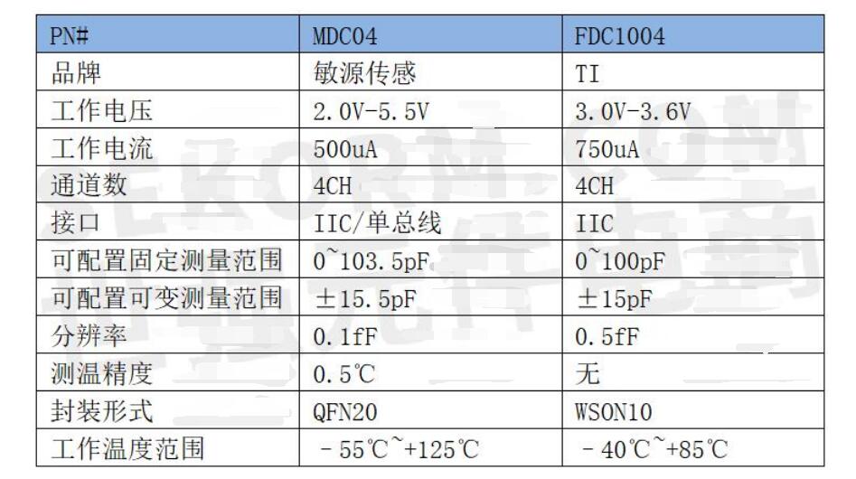 該電容傳感芯片MDC04在功能上可以替換TI公司的FDC1004芯片,如圖1所示為兩款芯片的主要參數(shù)對比。