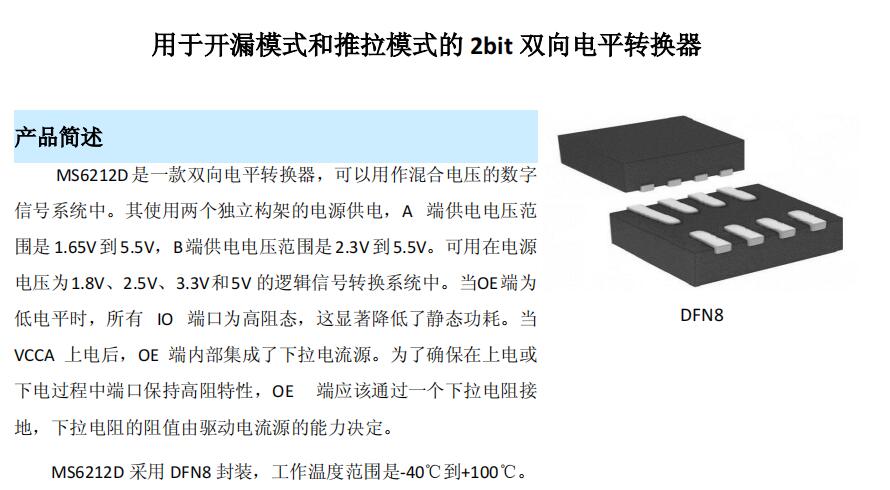 電平轉(zhuǎn)換芯片 - MS6212可以用于橋接兩個(gè)不同的電壓節(jié)點(diǎn),以成功連接電子系統(tǒng)中的邏輯門電平。它可以用在點(diǎn)對(duì)點(diǎn)拓?fù)渲校糜谶B接在不同接口電壓下相互操作的設(shè)備或系統(tǒng)中。它的主要目標(biāo)是用開漏模式與I/O口進(jìn)行數(shù)據(jù)連接,例如I2C和1-Wire,數(shù)據(jù)是雙向傳輸且不需要控制信號(hào),也可以用推拉模式與I/O口進(jìn)行數(shù)據(jù)連接。