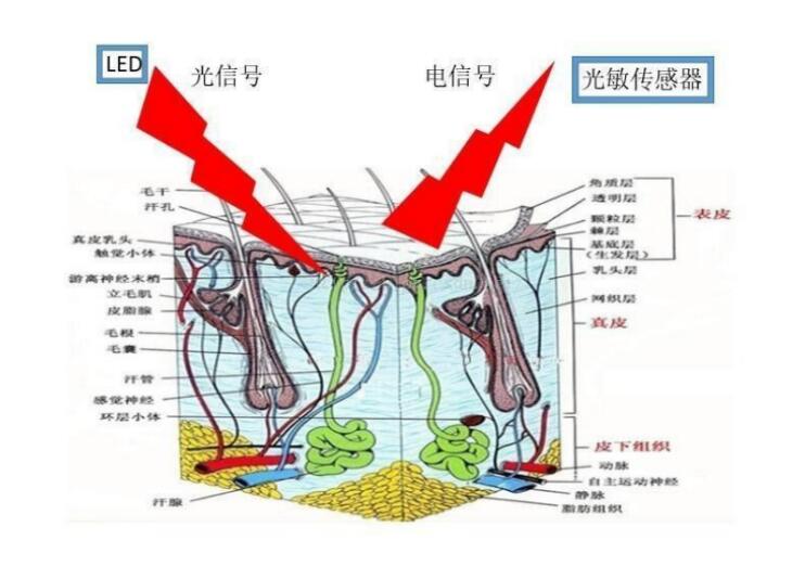 當(dāng)LED光射向皮膚,透過皮膚組織反射回的光被光敏傳感器接受并轉(zhuǎn)換成電信號(hào)再經(jīng)過AD轉(zhuǎn)換成數(shù)字信號(hào),簡(jiǎn)化過程:光-->?電-->?數(shù)字信號(hào)。