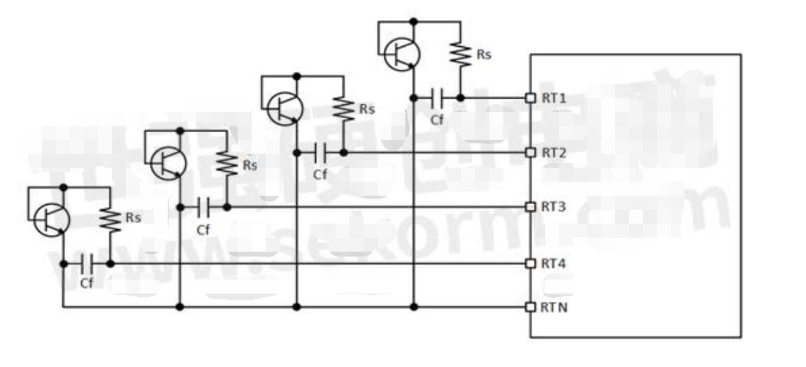 首先,外圍器件的參數(shù)選擇時,遠程測溫需要配合三極管或者二極管來采集溫度,推薦的電路圖如下:其中Rs選擇1.78k,1%精度,Cf選擇1nF,芯片VCC上并聯(lián)2.2uF-4.7uF電容。
