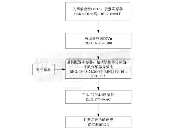 (2)根據(jù)實(shí)際需求頻率調(diào)整寄存器配置,例如在得知實(shí)際晶振為25.00172M時,需要輸出200M的精確頻率時,通過公式推出,所需的倍頻值為200M/25.00172M=7.99945。只需在寄存器進(jìn)行配置,可以使輸出頻率更接近200M。同理適用于其他在規(guī)格書范圍內(nèi)的輸出頻率。