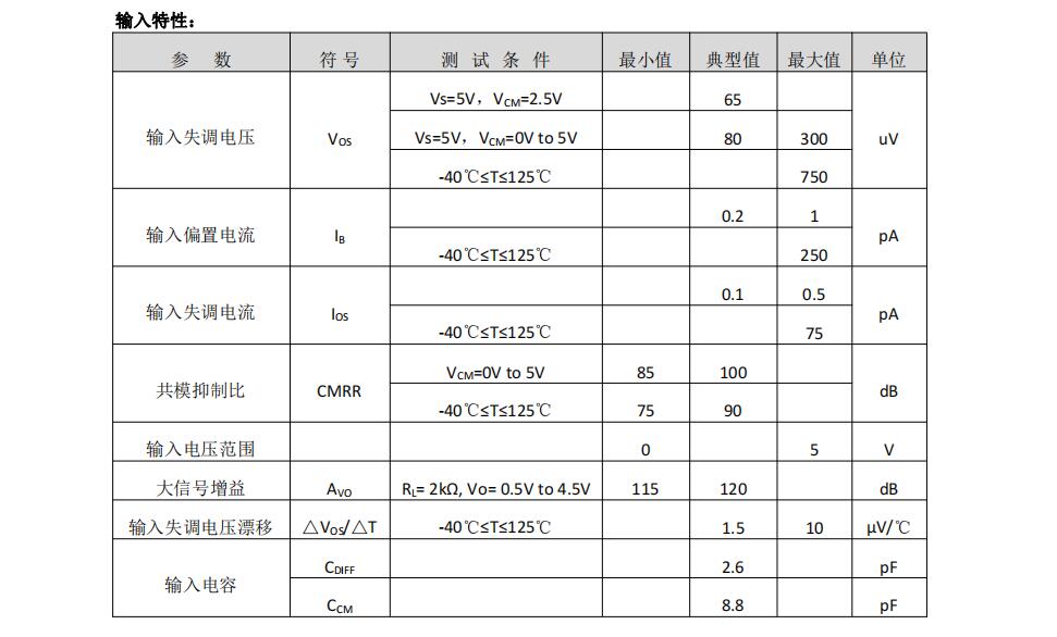 運放主要直流指標有輸入失調(diào)電壓、輸入失調(diào)電壓的溫度漂移(簡稱輸入失調(diào)電壓溫漂)、輸入偏置電流、輸入失調(diào)電流、輸入偏置電流的溫度漂移(簡稱輸入失調(diào)電流溫漂)、差模開環(huán)直流電壓增益、共模抑制比、電源電壓抑制比、輸出峰-峰值電壓、大共模輸入電壓、大差模輸入電壓。MS8312的直流指標如下: