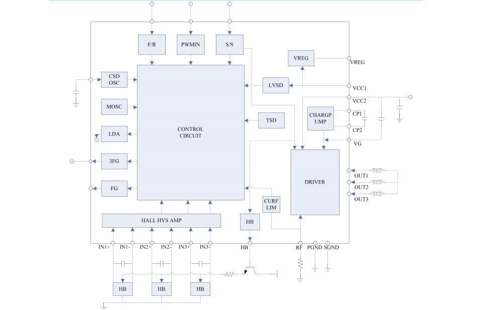 圖1是MS8828無刷電機(jī)驅(qū)動的內(nèi)部框圖及典型外圍電路,它是純硬件設(shè)計(jì),外圍電路連接正確、電機(jī)線和霍爾線序正確后,只需給芯片VCC電源供電即可驅(qū)動一個(gè)三相無刷電機(jī)轉(zhuǎn)動。