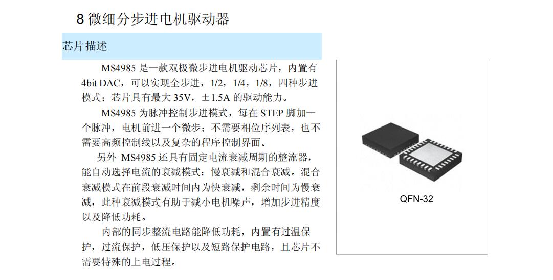 步進(jìn)馬達(dá)驅(qū)動(dòng)芯片 - MS4985為脈沖控制步進(jìn)模式,每在STEP腳加一個(gè)脈沖,電機(jī)前進(jìn)一個(gè)微步;不需要相位序列表,也不需要高頻控制線以及復(fù)雜的程序控制界面。