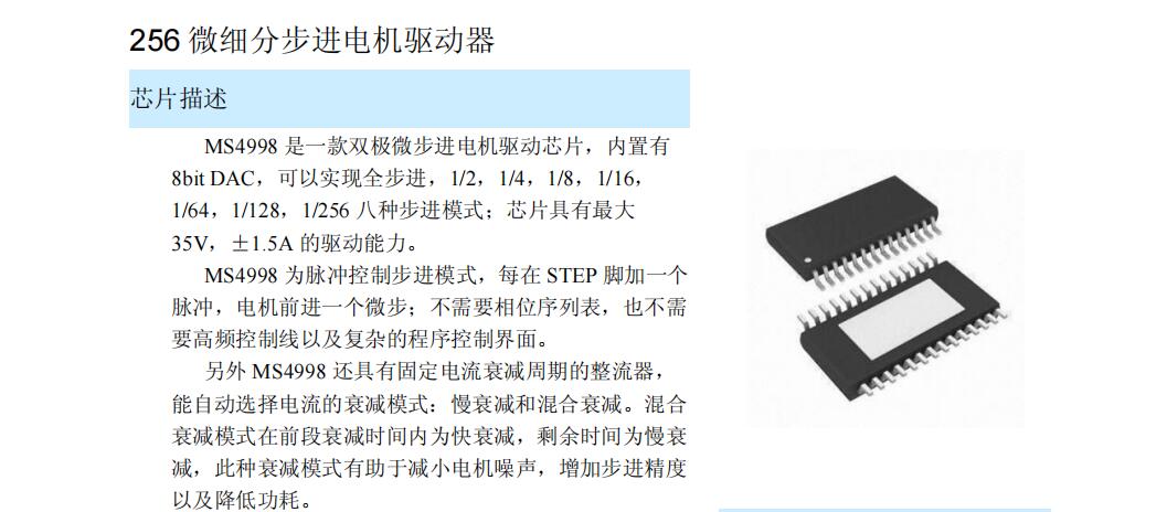 步進(jìn)馬達(dá)驅(qū)動(dòng)芯片 - MS4998為脈沖控制步進(jìn)模式,每在STEP腳加一個(gè)脈沖,電機(jī)前進(jìn)一個(gè)微步;不需要相位序列表,也不需要高頻控制線以及復(fù)雜的程序控制界面。