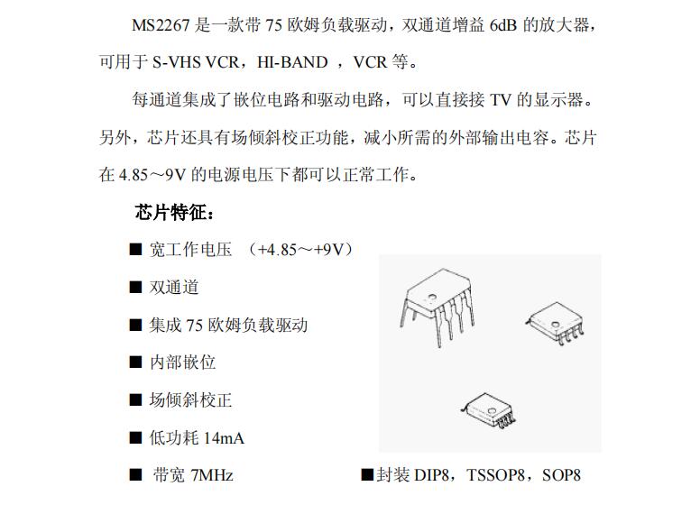 視頻驅(qū)動放大器 - MS2267每通道集成了嵌位電路和驅(qū)動電路,可以直接接TV的顯示器。另外,芯片還具有場傾斜校正功能,減小所需的外部輸出電容。芯片在4.85~9V的電源電壓下都可以正常工作。