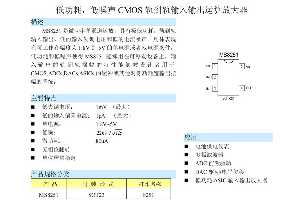低功耗運(yùn)算放大器 -?MS8251的主要特點(diǎn):