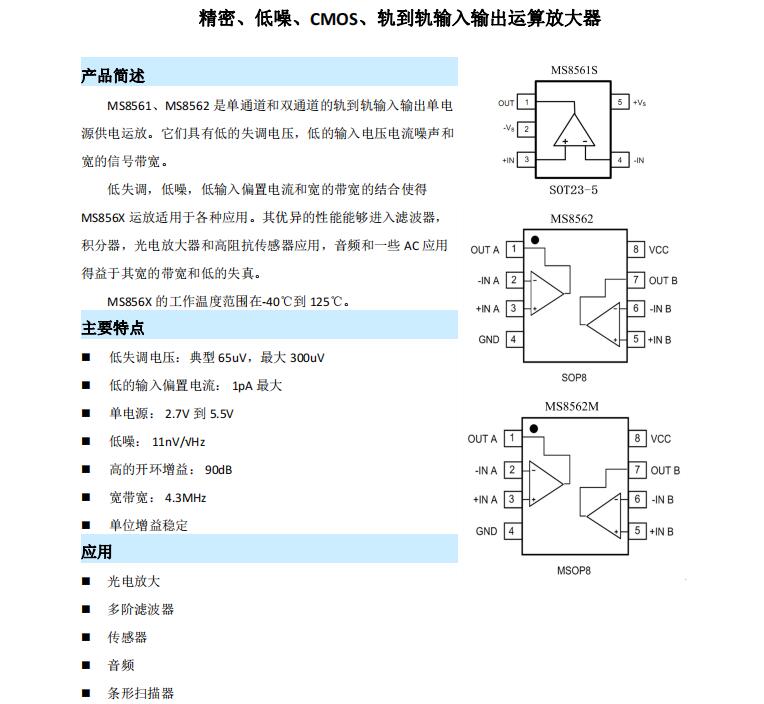 低失調(diào),低噪,低輸入偏置電流和寬的帶寬的結(jié)合使得MS856X運(yùn)放適用于各種應(yīng)用。其優(yōu)異的性能能夠進(jìn)入濾波器,積分器,光電放大器和高阻抗傳感器應(yīng)用,音頻和一些AC應(yīng)用得益于其寬的帶寬和低的失真。