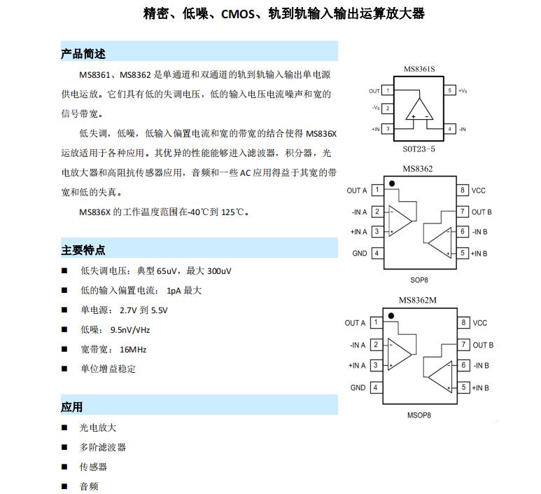 低噪聲運算放大器 -?MS8361、MS8362的主要特點: