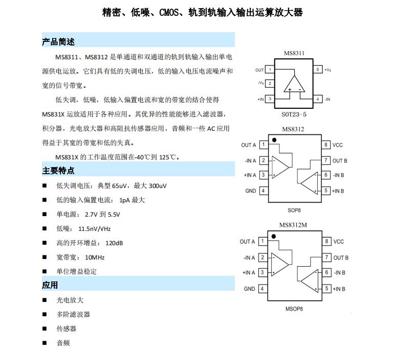 低失調(diào),低噪,低輸入偏置電流和寬的帶寬的結(jié)合使得MS831X運(yùn)放適用于各種應(yīng)用。其優(yōu)異的性能能夠進(jìn)入濾波器,積分器,光電放大器和高阻抗傳感器應(yīng)用,音頻和一些AC應(yīng)用得益于其寬的帶寬和低的失真。