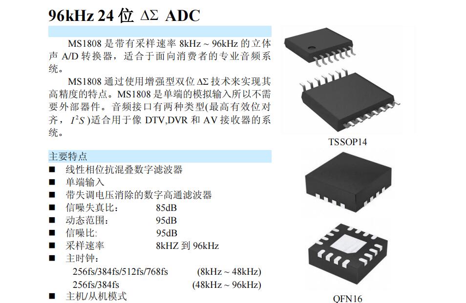 ADC芯片 -?MS1808是單端的模擬輸入所以不需要外部器件。音頻接口有兩種類型(高有效位對(duì)齊,S2S)適合用于像DTV,DVR和AV接收器的系統(tǒng)。