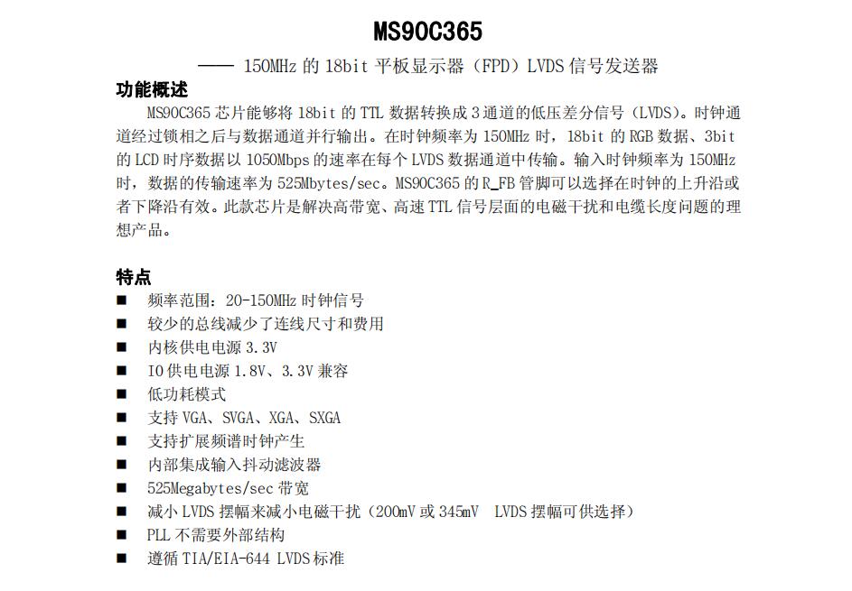 工采網(wǎng)代理的國(guó)產(chǎn)品牌Ruimeng?TECHNOLOGY推出的低壓差分傳輸接口芯片 -?MS90C365芯片能夠?qū)?8bit的TTL數(shù)據(jù)轉(zhuǎn)換成3通道的低壓差分信號(hào)(LVDS)。時(shí)鐘通道經(jīng)過(guò)鎖相之后與數(shù)據(jù)通道并行輸出。在時(shí)鐘頻率為150MHz時(shí),18bit的RGB數(shù)據(jù)、3bit的LCD時(shí)序數(shù)據(jù)以1050Mbps的速率在每個(gè)LVDS數(shù)據(jù)通道中傳輸。輸入時(shí)鐘頻率為150MHz時(shí),數(shù)據(jù)的傳輸速率為525Mbytes/sec。MS90C365的R_FB管腳可以選擇在時(shí)鐘的上升沿或者下降沿有效。此款芯片是解決高帶寬、高速TTL信號(hào)層面的電磁干擾和電纜長(zhǎng)度問(wèn)題的理想產(chǎn)品。