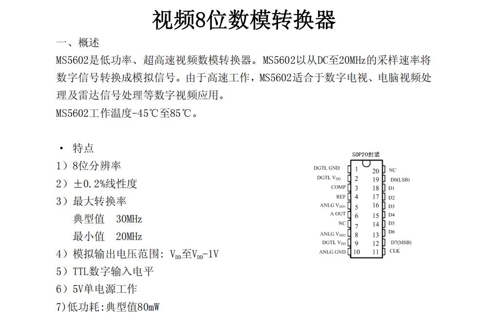 工采網(wǎng)代理的國產(chǎn)品牌Ruimeng?TECHNOLOGY推出的高速數(shù)模轉(zhuǎn)換芯片 -?MS5602是低功率、超高速視頻數(shù)模轉(zhuǎn)換器。MS5602以從DC至20MHz的采樣速率將數(shù)字信號轉(zhuǎn)換成模擬信號。由于高速工作,MS5602適合于數(shù)字電視、電腦視頻處理及雷達(dá)信號處理等數(shù)字視頻應(yīng)用。