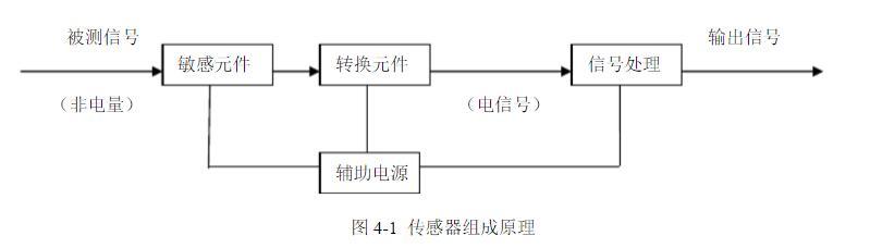 傳感器一般由敏感元件、轉(zhuǎn)換元件和信號處理電路3部分組成,有時(shí)需要加輔助電源,其組成原理如圖4-1所示。