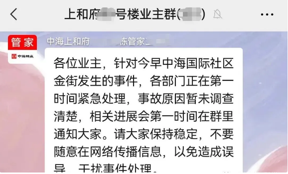 有中海上和府小區(qū)業(yè)主將小區(qū)物業(yè)的通知發(fā)在了網(wǎng)上,通知顯示,“各部門正在第一時(shí)間緊急處理,事故原因暫未調(diào)查清楚,相關(guān)情況會(huì)第一時(shí)間在群里通知。請(qǐng)大家保持穩(wěn)定,不要隨意在網(wǎng)絡(luò)傳播信息。以免造成誤導(dǎo),干擾事件處理”。