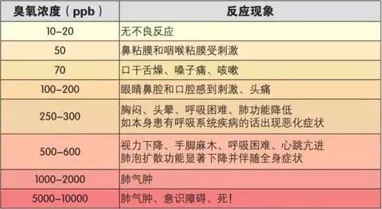 按照國(guó)際標(biāo)準(zhǔn),達(dá)0.5-1ppm時(shí)可引起口干等不適;達(dá)1-4ppm時(shí)可引起咳嗽;達(dá)4-10ppm時(shí)可引起強(qiáng)烈咳嗽。人不能直接暴露在高濃度的臭氧之下的太長(zhǎng)時(shí)間(國(guó)家衛(wèi)生部規(guī)定的臭氧安全濃度為0.1ppm(空氣中))。
