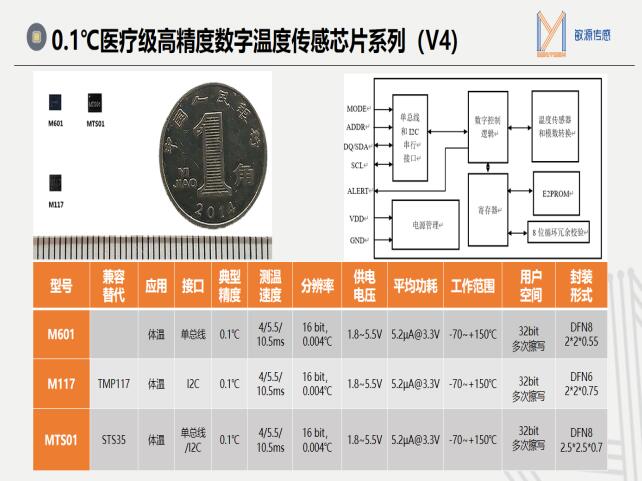 與國外競品相比,M601、M117、MTS01系列芯片精度及分辨率高,內(nèi)置16?bit ADC,分辨率0.004°C;功耗低,測溫平均電流5.2μA@3.3V;測溫速度快,溫度轉(zhuǎn)換時(shí)間10.5ms/5.5ms/4ms可配置;供電電壓范圍寬,1.8V~5.5V;工作溫度范圍寬,-70°C~+150°C;而且,部分芯片可Pin to Pin兼容國外競品,如,M117可Pin to Pin兼容替代TI TMP117、MTS01可Pin to Pin兼容替代Sensirion STS35等。