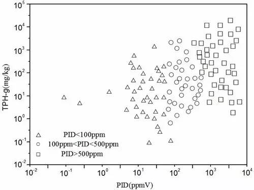 PID光離子化快速檢測裝置顯示的讀數(shù)是土壤中揮發(fā)出的VOCs的總量,并不能對土壤中存在的各種揮發(fā)性有機物單獨進行檢測。而在實際土壤中,往往各種揮發(fā)性有機物是同時存在的,這些揮發(fā)性有機物都會對PID的示數(shù)有所貢獻。PID檢測器對不同類別的VOCs的響應(yīng)程度也是不同的。通常來說,PID對各種VOCs的靈敏度如下所示:芳香族化合物和碘化物 > 石蠟、酮、醚、胺、硫化物 > 酯、醛、醇、脂肪 >鹵化脂、乙烷 > 甲烷(無響應(yīng))。朝陽科技大學(xué)的劉敏信等人對PID與土壤中TPH的濃度關(guān)系做過詳細的研究,將土壤同時測定PID以及GC-MS,認為氣態(tài)總石油烴(TPH-g)與PID的檢測值存在一定的相關(guān)性,如圖2所示,其中PID(ppmV)表示抽取的土壤空隙氣體樣品中PID含量換算所得的體積分數(shù)。尤其是在砂和粘土中相關(guān)系數(shù)可達0.8以上,顯示出高度正相關(guān),并且這種相關(guān)性隨著土壤中TPH-g的濃度上升,會有所增加。