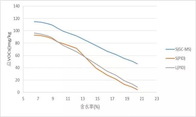 這主要有兩個原因:(1)首先,水蒸氣與VOCs同時進入PID檢測器后,盡管水蒸氣(IP為12.59 eV)不能被PID燈離子化,但水蒸氣可以在離子化腔中反射、散射和吸收紫外線,因此,水蒸氣對于PID讀數(shù)存在一定的干擾。檢測器對VOCs的響應(yīng)值會降低,從而PID的示數(shù)偏低,干擾檢測結(jié)果。(2)其次是含水率對VOC分布的影響,這與土壤水分對揮發(fā)性有機物在土壤中的吸附行為的影響有關(guān)。通常,將由土壤固體、土壤空氣、孔隙水等組成的復(fù)雜系統(tǒng)稱為包氣帶。對揮發(fā)性有機污染物而言,在包氣帶中會存在吸附于土壤有機質(zhì)的固態(tài)、溶于孔隙水的液態(tài)和分布于土壤空氣中的氣態(tài)三種相態(tài),形成一個復(fù)雜的多相動態(tài)平衡。有機污染物雖然多具憎水性,但在水中仍有一定的溶解度。含水量越大,有機污染物在水中的溶解量越多,相應(yīng)土壤吸附量減少,這利于有機污染物的遷移。