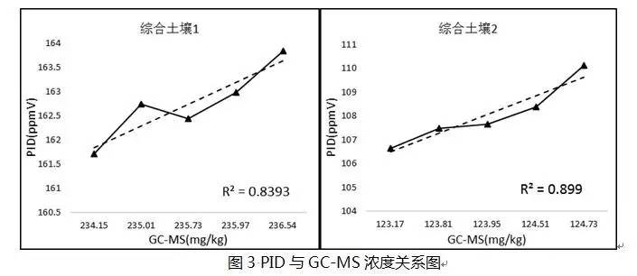 將文獻中報道的PID數(shù)據(jù)進行對比,考察同時含有數(shù)種有機污染物的土壤。如圖3所示,PID的示數(shù)與GC-MS的檢測結(jié)果呈現(xiàn)出較好的相關(guān)性,數(shù)據(jù)線性擬合的結(jié)果表明,在兩種不同濃度下線性擬合的相關(guān)系數(shù)R2分別為0.8393和0.8990。這說明PID示數(shù)能夠較好的反應(yīng)土壤中揮發(fā)性有機物的含量。