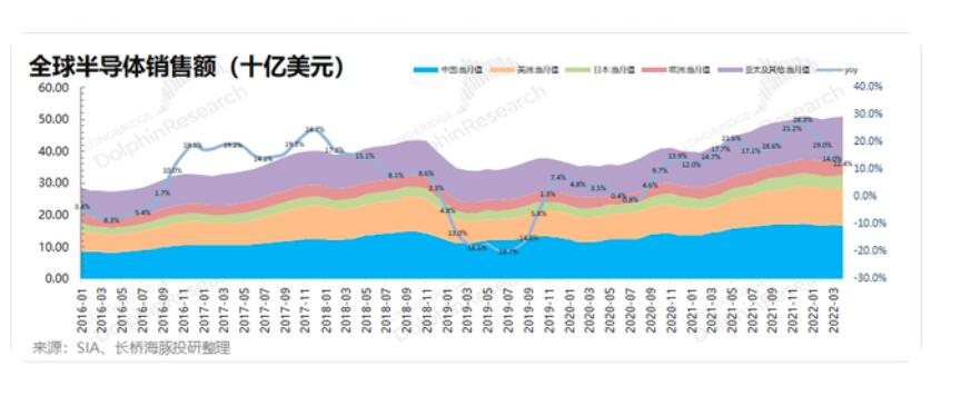 從近期的全球半導(dǎo)體銷售額看,單月銷售額已經(jīng)穩(wěn)定在500億美元以上。今年以來在局部沖突、疫情等因素的影響下,半導(dǎo)體銷售額的增速雖略有回落,但仍保持著兩位數(shù)的增長。