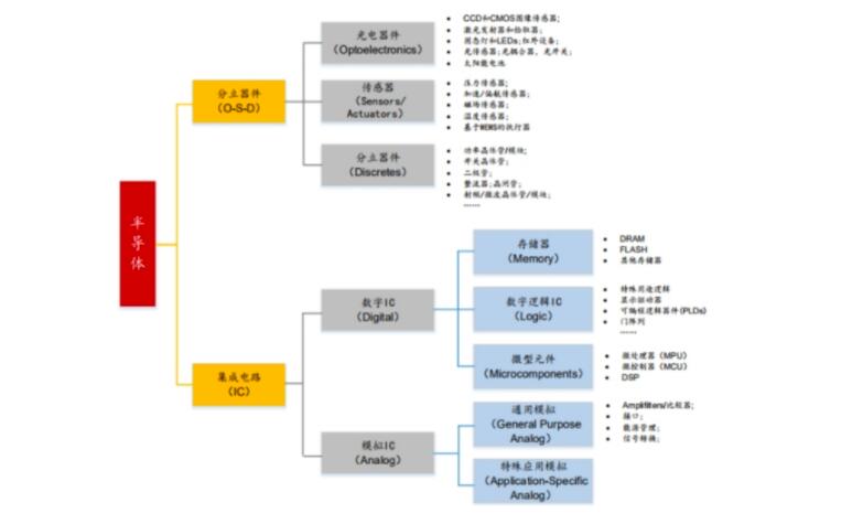 先從半導(dǎo)體的分類入手,熟悉一下半導(dǎo)體的具體分類。半導(dǎo)體主要分為5類,分別是數(shù)字芯片、模擬芯片、光電器件、傳感器和分立器件。數(shù)字芯片和模擬芯片是半導(dǎo)體行業(yè)重要的組成部分。模擬芯片主要用于模擬信號(聲音、光線、溫度等),包括有運算放大器、線性穩(wěn)壓器、電源管理等。而數(shù)字芯片主要進行算術(shù)和邏輯運算,包括有CPU、微處理器、存儲器、微控制器等。