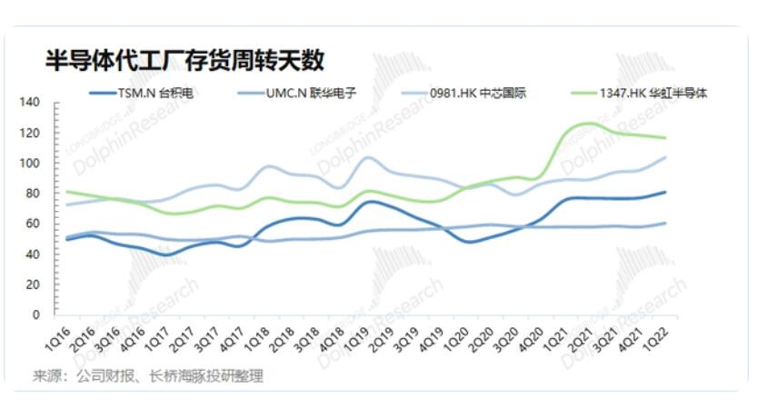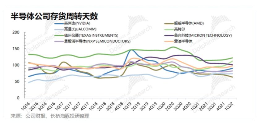 從全球主要半導(dǎo)體公司的存貨情況看,呈現(xiàn)結(jié)構(gòu)化的特征,其中有部分公司的存貨周轉(zhuǎn)天數(shù)已經(jīng)開始出現(xiàn)回升跡象。