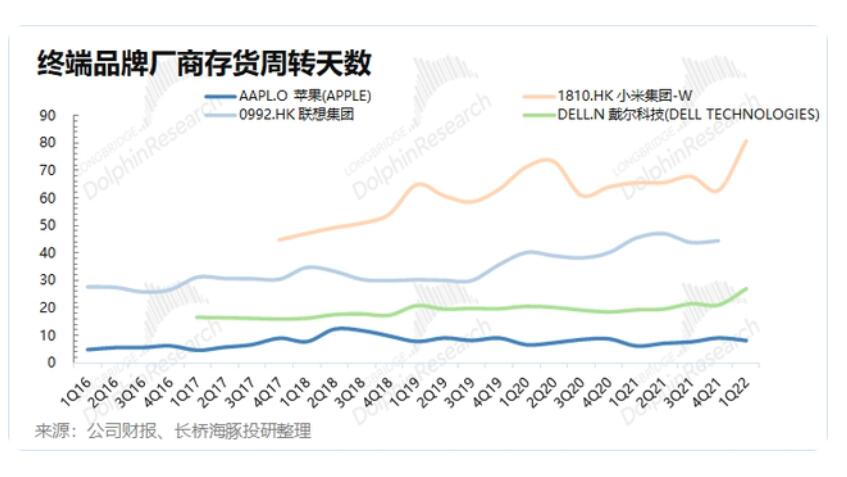 近期半導(dǎo)體庫存提升的根源在哪?那要從下游終端品牌市場中去找答案。對于下游終端品牌市場,海豚君主要選取了蘋果、小米、聯(lián)想和戴爾四家主要的終端廠商。