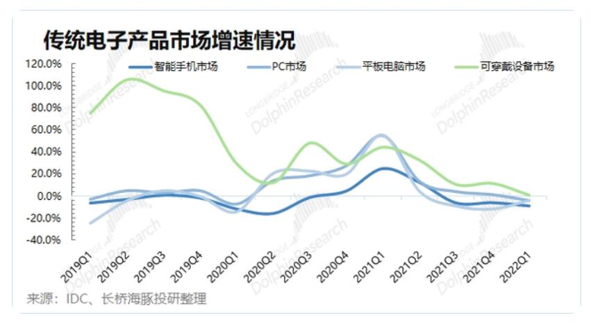 產(chǎn)品創(chuàng)新匱乏,使得傳統(tǒng)電子產(chǎn)品市場的需求出現(xiàn)萎縮。從2022年一季度各傳統(tǒng)電子市場的表現(xiàn)看,全面呈現(xiàn)不增長或下滑的情況。而原本寄予厚望的可穿戴設(shè)備產(chǎn)品在一季度的出貨量也陷入了不增長的困境。傳統(tǒng)市場逐漸衰弱的情況下,急需要新市場的帶動。