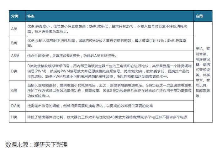 音頻功放芯片是指把來自音源或前級(jí)放大器輸出的弱信號(hào)放大并推動(dòng)一定功率的音箱發(fā)出聲音的集成電路,作為多媒體播放設(shè)備的核心部件,決定了播放設(shè)備的音質(zhì)與工作效率。根據(jù)放大電路的導(dǎo)電方式不同,音頻功放可分為模擬功放和數(shù)字功放。